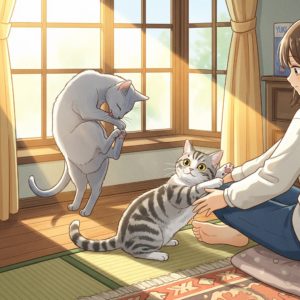 でも、時々、二匹が、同じ出窓のクッションの上で、少しだけ距離を空けながら、でも、確かに同じ方向を向いて、外を眺めている姿が見られるようになった。