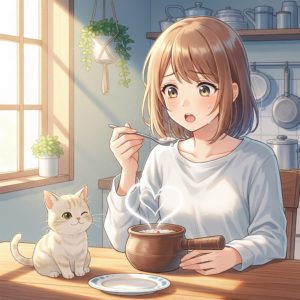 「美味しいね、つむぎ」 つむぎは「にゃあ」と応えるように鳴き、かえでの足元で尻尾を揺らした。