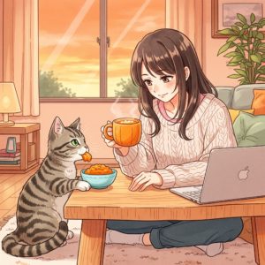 「はい、つむぎ。今日も一日、お疲れ様」 スコーンを半分に割って、つむぎ用のお皿にそっと置く。もちろん、猫が食べても大丈夫な、特別なレシピだ。