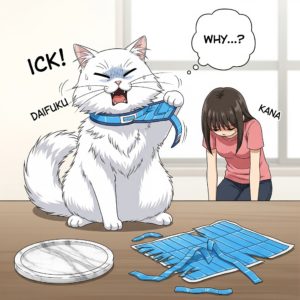 まるで不倶戴天の敵のように、「フーッ!」と威嚇し、電光石火の猫パンチでネッククーラーを叩き落とし、部屋の隅へと逃げてしまった。